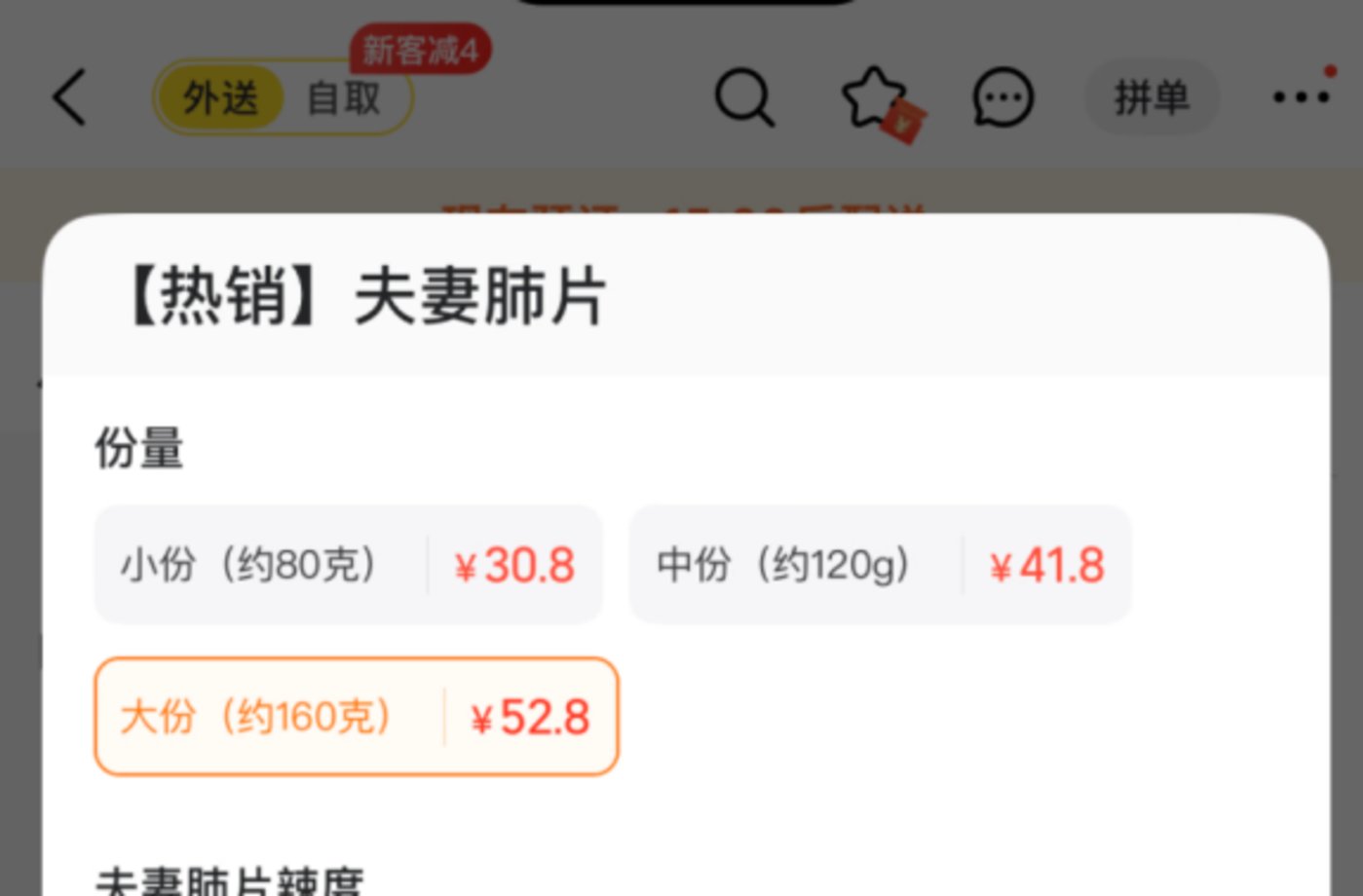 12 月 26 日,雷达财经通过某外卖平台了解到,在紫燕的一家线上外卖店中,一份 160 克的夫妻肺片原价为 52.8 元,按此计算,其每斤价格再次上涨,达到 165 元。