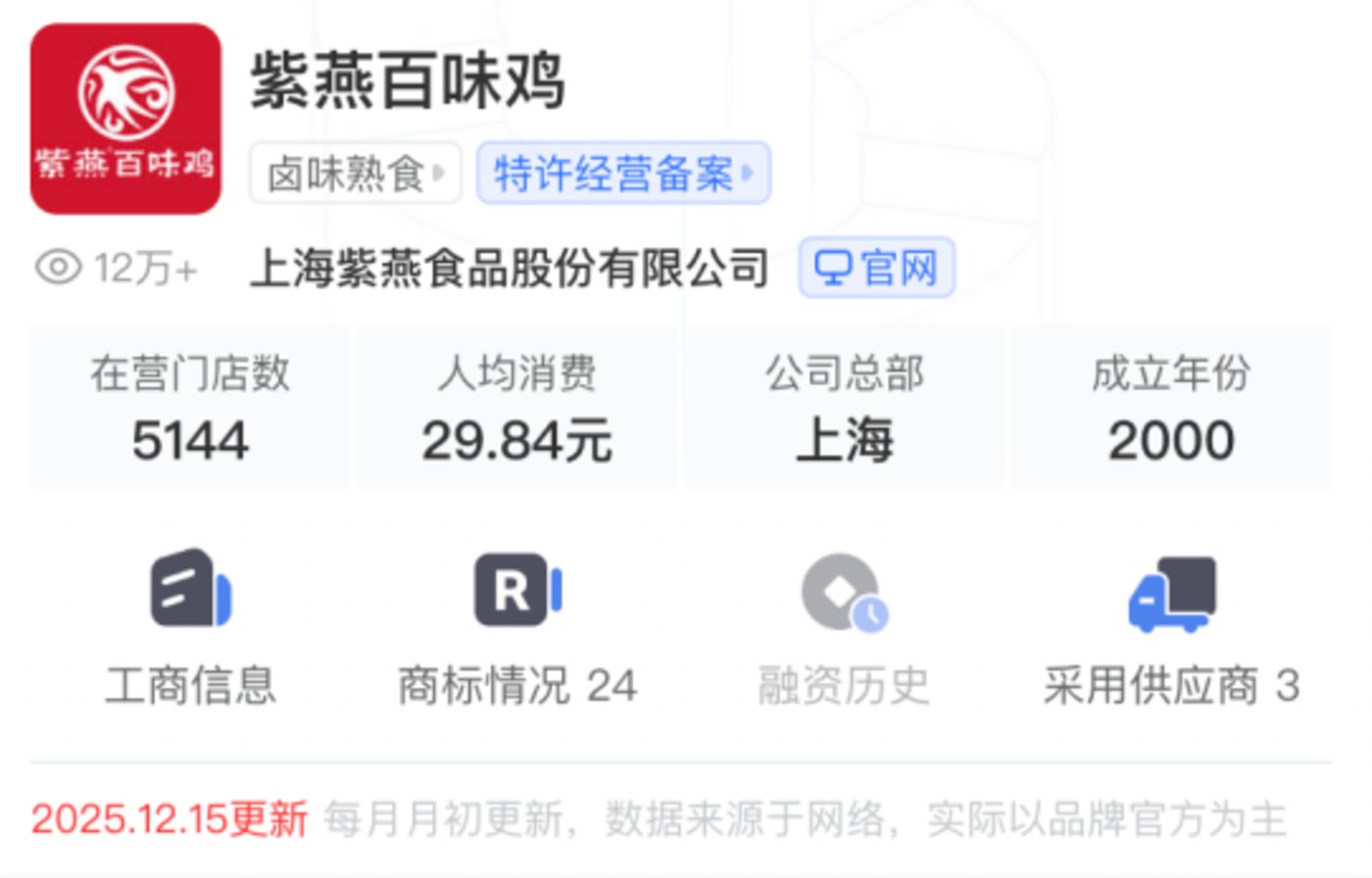 天眼查显示,紫燕食品于 2022 年登陆 A 股。截至 12 月 26 日收盘,紫燕食品股价为 19.53 元/股,最新市值为 80.76 亿元。