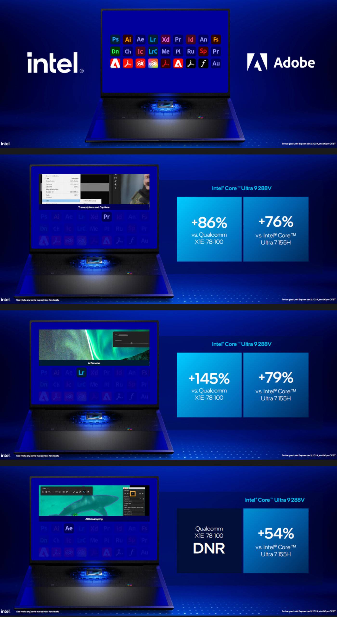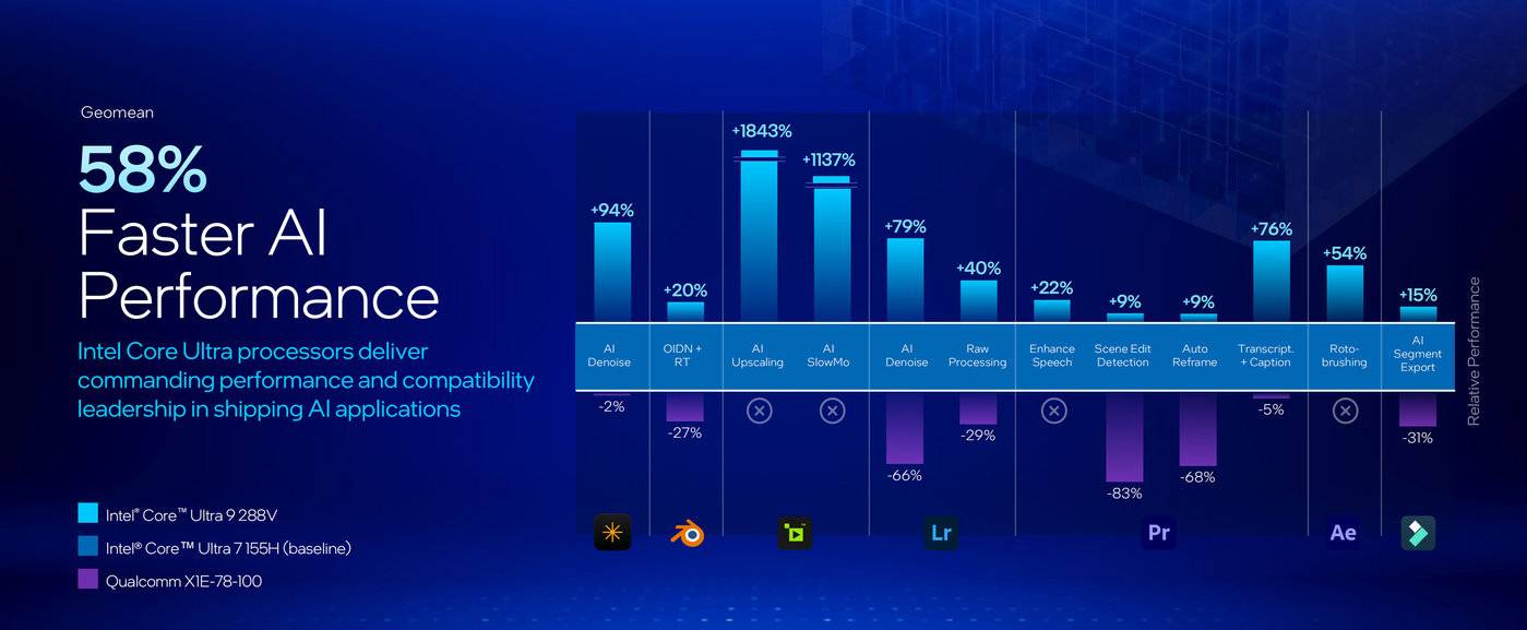 英特尔列出了其在 Adobe 软件 Pr、Lr、Ae 中部分功能的性能对比,与高通 X1E-78-100 和上代 Ultra 7 155H 的对比中,Ultra 9 288V 也都有大幅度的领先,这得益于与合作伙伴更深层次的合作,可以在新硬件推出后第一时间给予优化支持。
