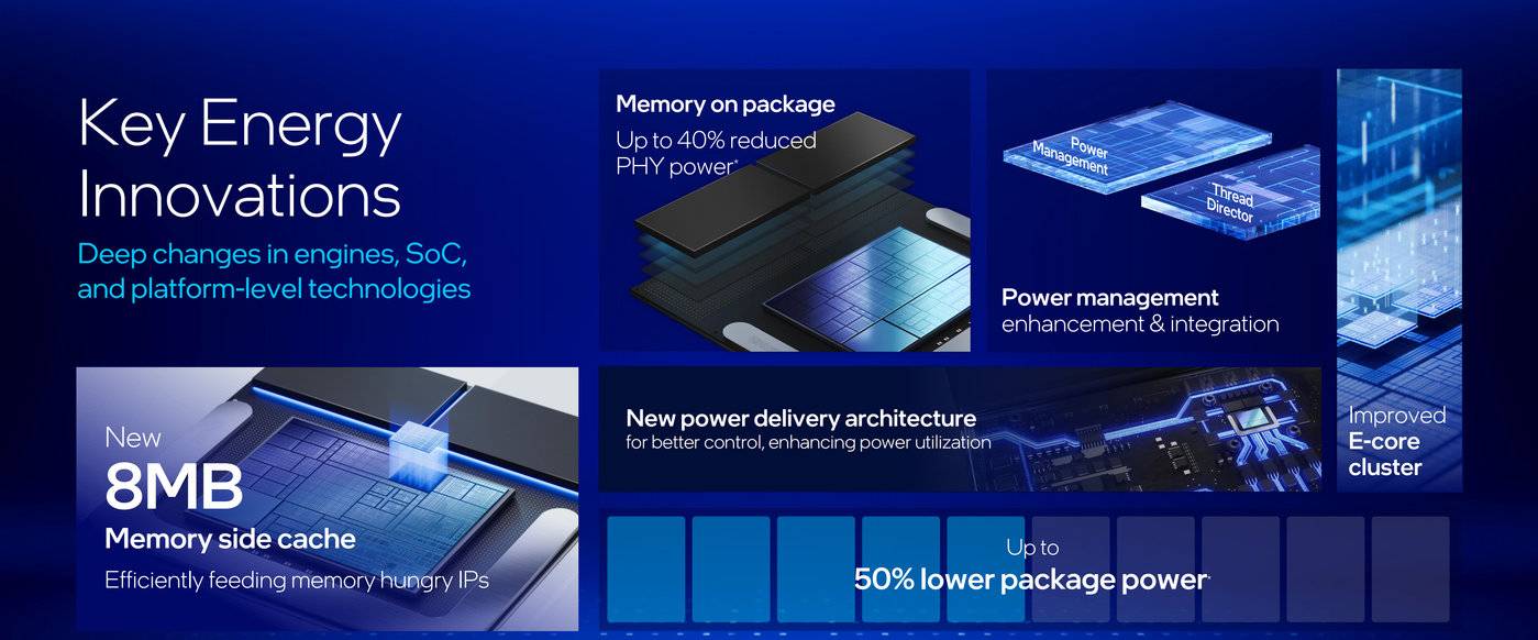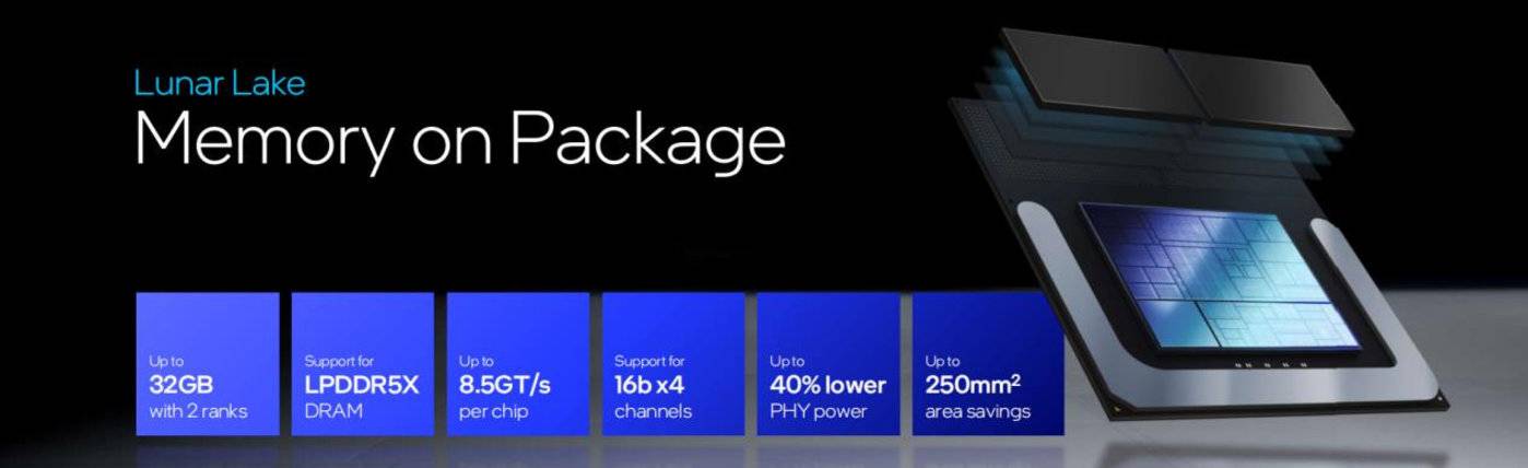 另外在架构方面更为显著的变化是整块处理器中封装进了内存颗粒,可选 16GB 或 32GB,频率为 LPDDR5x-8533MHz,这虽然锁死了 OEM 厂商或用户对于内存方面的可升级性,但是会在内存层面最高降低 40% 的物理功耗,还会节省主板与机身空间。
