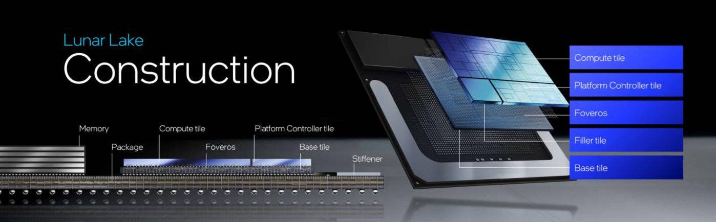 Lunar Lake 与上代的 Meteor Lake 架构均采用了模块设计,3D Foveros 封装,不过 Lunar Lake 的核心区域不再为 4 个 Tile,而是两个 Tile,分别为 Compute Tile 与 Platform Controller Tile,其中 Compute Tile 采用台积电 N3B 工艺,CPU 核心、核显、媒体引擎、显示引擎、NPU 等都位于其中,而 Wi-Fi 6、蓝牙、PCIe 控制器、雷电控制器等布置在了 Platform Controller Tile 中,采用台积电 N6 工艺。