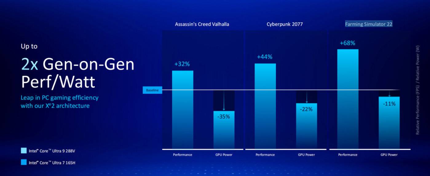 游戏场景下的核显能耗也有很大的提升幅度,Ultra 9 288V 的 Xe2 架构核显对比 Ultra 7 165H 的核显在 《刺客信条:英灵殿》、《赛博朋克 2077》、《模拟农场 22》 中,最高有 68% 的性能提升和 35% 的核显功耗下降。