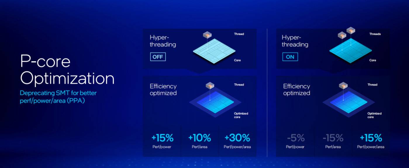 本代的 Lion Cove 并不支持超线程,不过在英特尔给予的数据中,我们可以看到,在关闭超线程后,Lion Cove 可以达成更高的每瓦性能、芯片每单位面积性能、芯片每单位面积每功耗性能,以达成更优秀的能耗表现与性能表现还平衡了芯片规模。