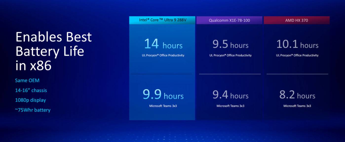 在相同 OEM 提供的 14~16 英寸屏幕的模具、1080P 屏幕、75Whr 的电池容量下,同样在 UL Procyon Office Productivity 测试与 Microsoft Team 3x3 场景中,Ultra 9 288V 可以分别达到 14 小时和 9.9 小时的续航能力,而高通 X1E-78-100 的成绩为 9.5 小时与 9.4 小时,AMD HX 370 的成绩分别为 10.1 小时和 8.2 小时。