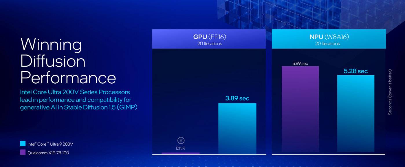 在常用的本地生成式 AI 应用 Stable Diffusion 1.5(GIMP) 中,Ultra 9 288V 使用 GPU(FP16) 进行运算时..... 没有对比,因为用来对比的高通 X1E-78-100 又一次的 「DNR」 了,而使用 NPU(W8A16) 时,Ultra 9 288V 的速度更快一些。