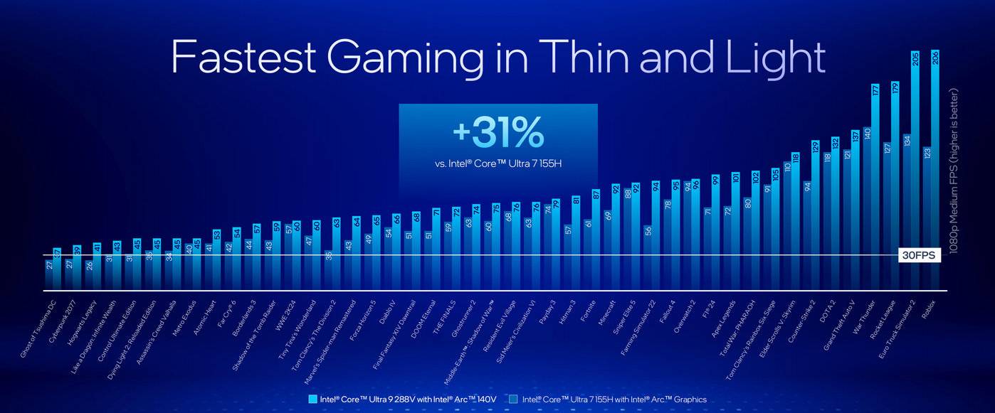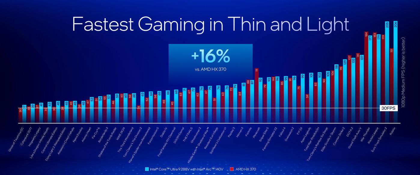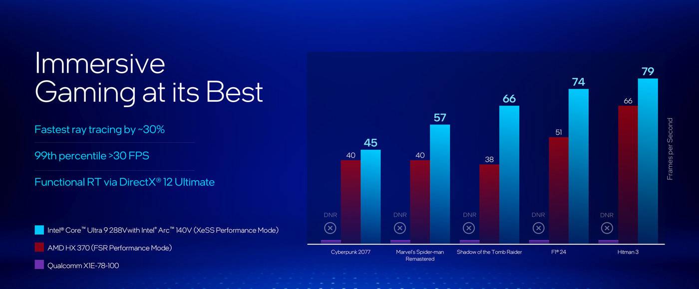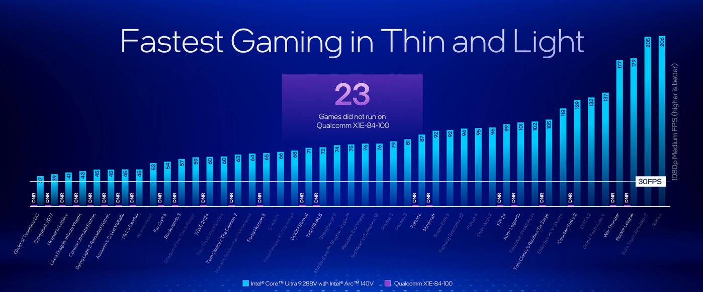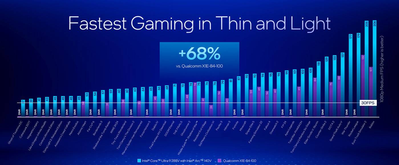 在 45 款游戏中,Ultra 9 288V 的平均帧数表现超越 Ultra 7 155H 31%;超越 AMD HX 370 16%;高通 X1E-84-100 则是有 23 款游戏不能运行,在其余可运行的游戏中,Ultra 9 288V 的平均帧数领先幅度达到 68%。