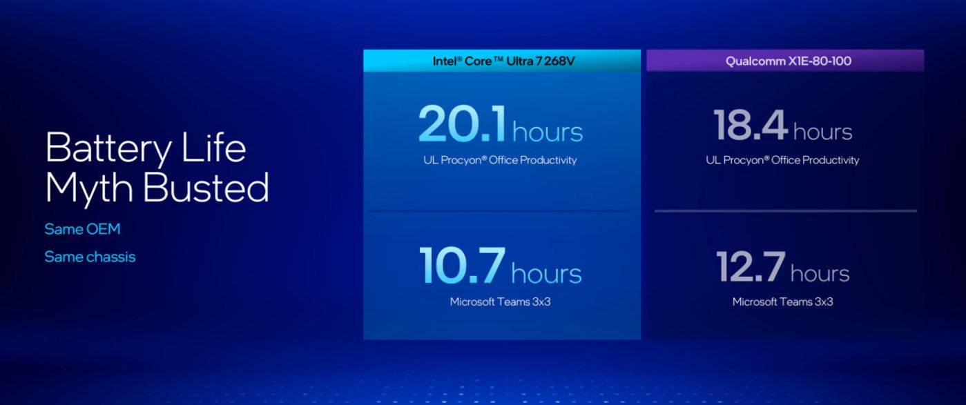 到续航方面,英特尔官方给出了两组数据。在相同 OEM 提供的相同模具下,在 UL Procyon Office Productivity 测试与 Microsoft Team 3x3 场景中,Ultra 7 268V 的续航时长可以达到 20.1 小时和 10.7 小时,而高通 X1E-80-100 则是 18.4 小时与 12.7 小时。