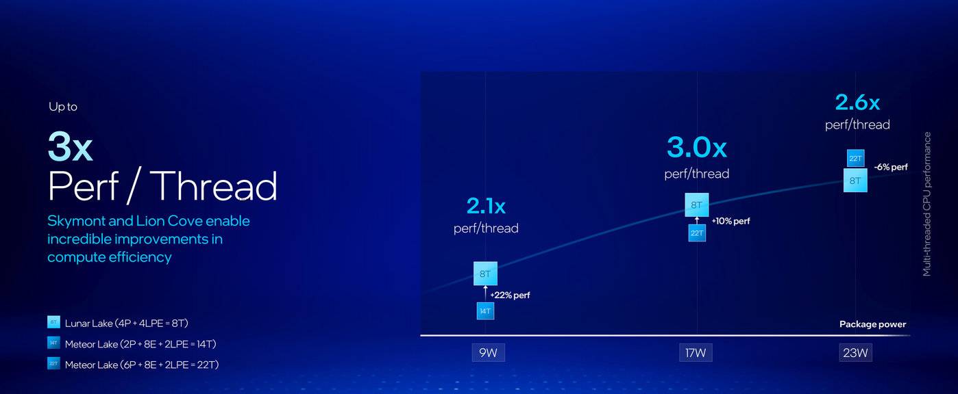 具体到多核性能方面,在低功耗区间段内,凭借着极其优秀的能效比,Lunar Lake 可以以 8 核心 8 线程的规格实现对规格更高的上代 Meteor Lake 产品完成性能反超。在功耗为 9W 时,4P+4E、8T 的 Lunar Lake 性能领先 2P+8E+2PE、14T 的 Meteor Lake 22%,每线程性能领先 2.1 倍;在功耗为 17W 时,4P+4E、8T 的 Lunar Lake 性能领先 6P+8E+2LPE、22T 的 Meteor Lake 10%,每线程性能领先 3 倍;在 23W 时,4P+4E、8T 的 Lunar Lake 性能仅落后 6P+8E+2LPE、22T 的 Meteor Lake 6%,每线程性能领先幅度为 2.6 倍。