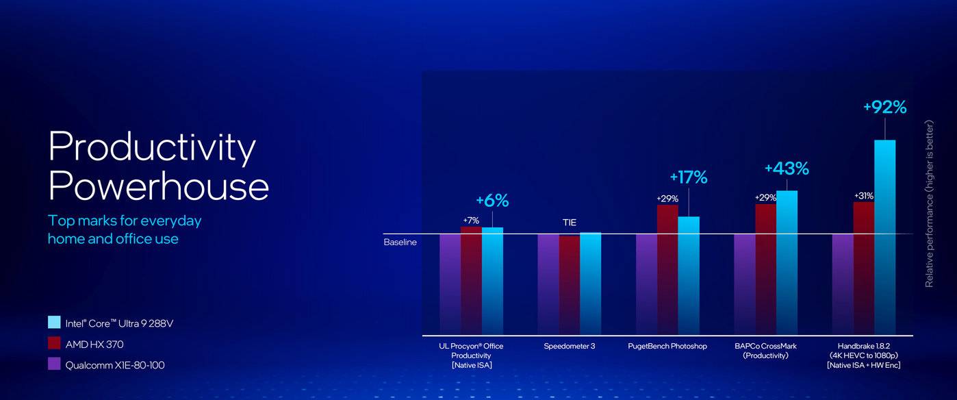 在生产力方面,Ultra 9 288V 在五个维度的测试中,也领先于高通骁龙 X1E-80-100 和 AMD HX 370。