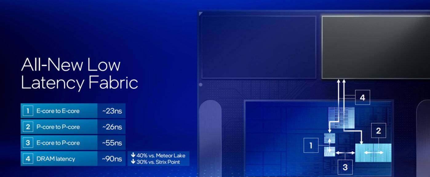 通过更低延迟的总线,缩小了 P 核与 E 核间的访问延迟,内存则是再加上 8MB 内存侧缓存,内存延时被降低到了 90ns 左右,相比于 Meteor Lake 降低了 40%,比 Strix Point 降低了 30%。