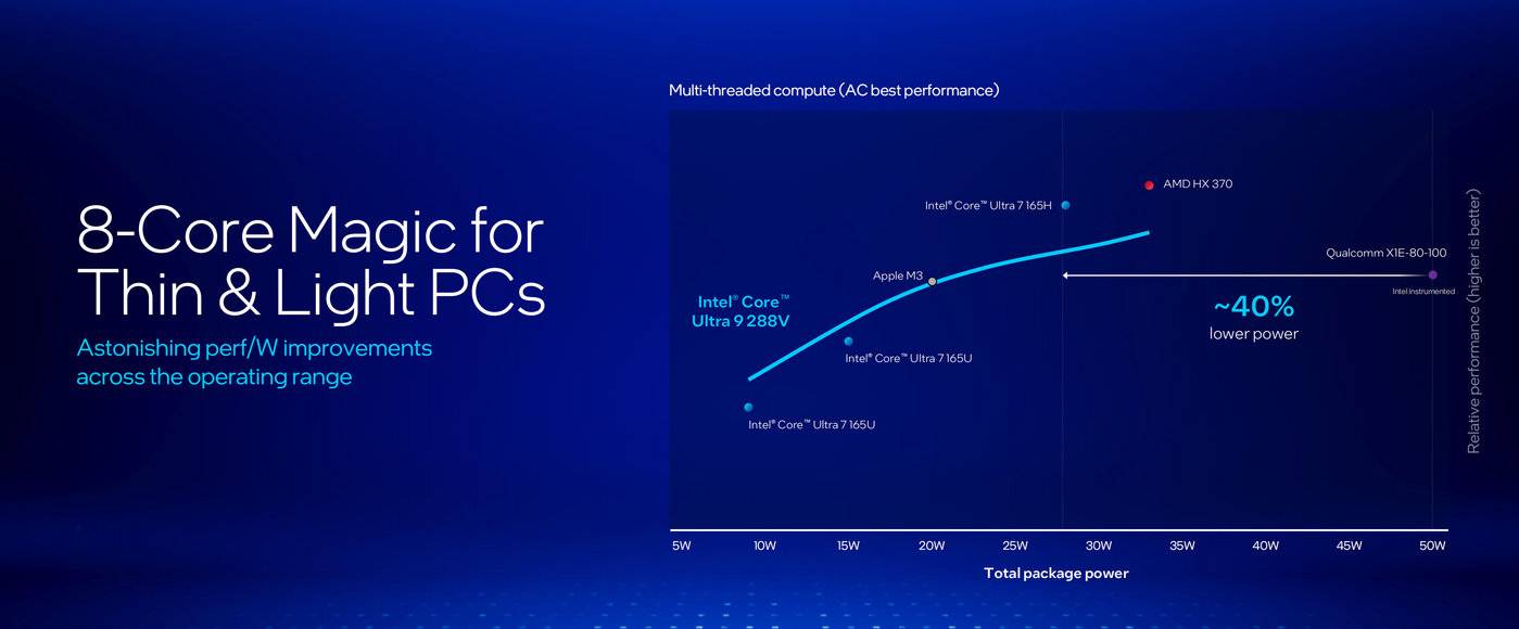 在功耗性能曲线上,英特尔着重标记了 Ultra 9 288V 可以在减少 40% 功耗的情况下,达到高通 X1E-80-100 50W 功耗时的多核心性能性能表现;在大约 20W 功耗时,与苹果 M3 性能持平;在 15W 功耗以内时,领先 Ultra 7 165U。