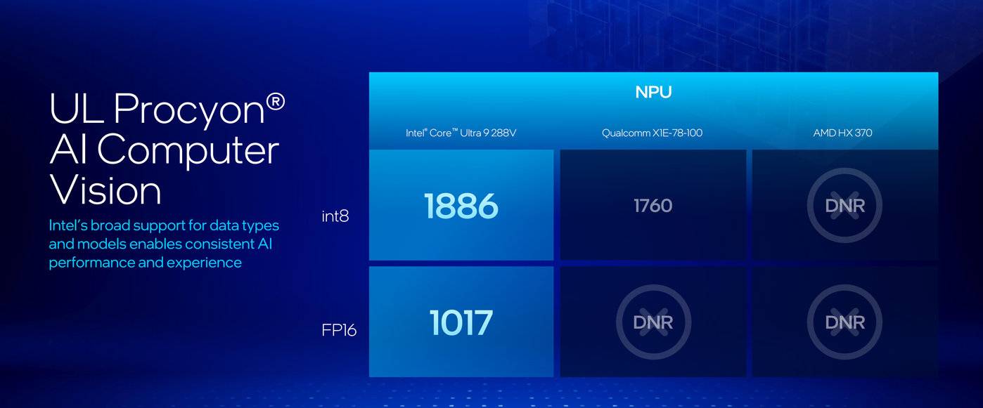 在 UL Procyon 的 AI Computer Vision 测试中,Ultra 9 288V 的 int8 性能得分 1886 分,FP16 性能得分 1017,高通仅能完成 int8 的测试,测试成绩为 1760,AMD HX 370 在两项测试中都无法完成。