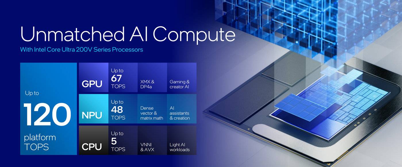 在 Lunar Lake 中,CPU 算力为 5 TOPS,GPU 为 67 TOPS,专用于 AI 计算的 NPU 单元为 49 TOPS。