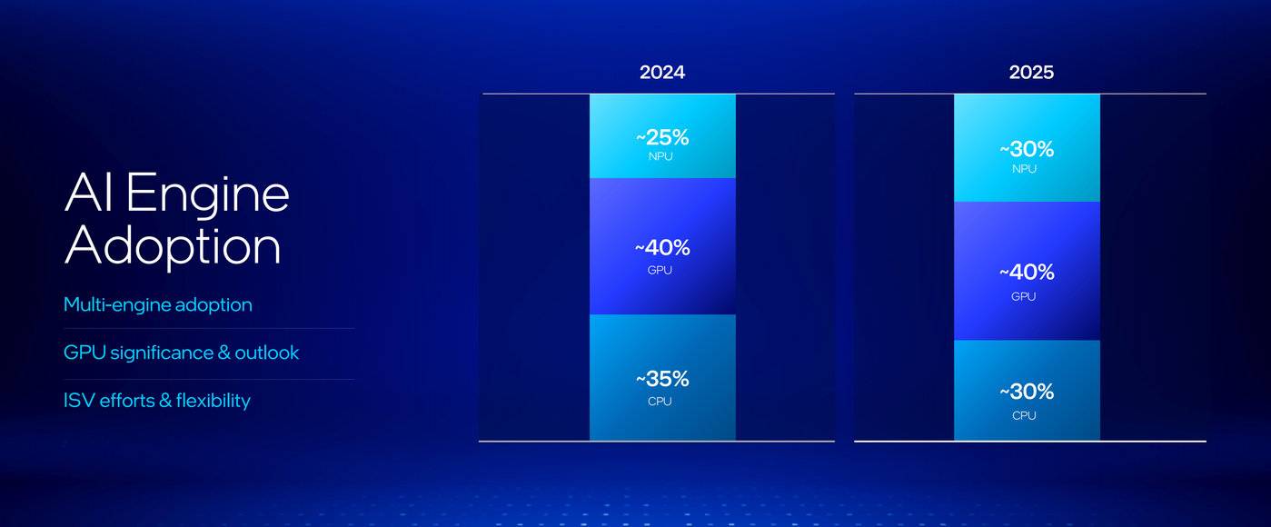对于当下 AI 应用对 CPU、GPU 以及 NPU 的利用率,目前 NPU 占比 25%,GPU 占比 40%,CPU 占比 35%,英特尔预测在 2025 年,NPU 的利用率占比提高,CPU 则会降低。一般情况下来讲,对于当下的 AI 应用,CPU 虽然通用性更广,但是其算力对比 GPU、NPU 是更低的,所以如果能将 AI 计算负载从 CPU 逐渐转移到 NPU 与 GPU,那么对于 AI 应用的运行速度、能效比等显然是更好的选择。