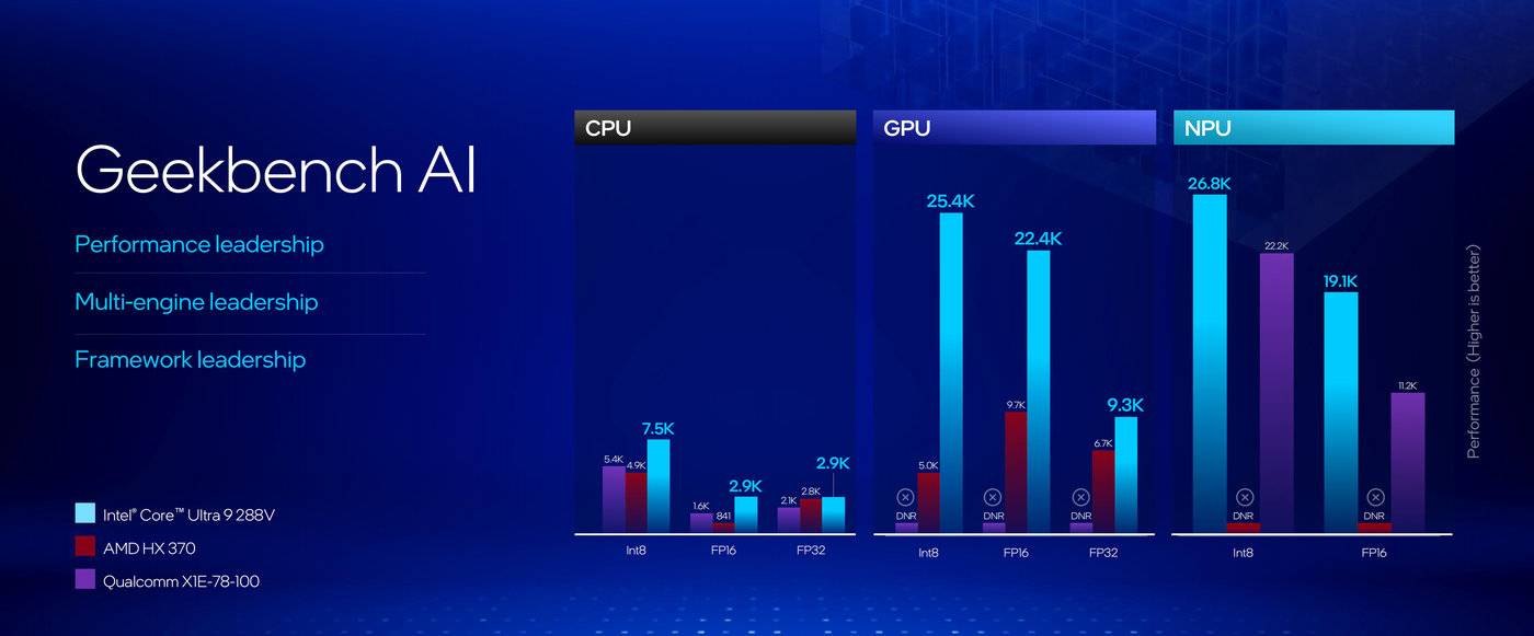 在 Geekbench AI 项目测试,Ultra 9 288V 在 CPU、GPU 和 NPU 的性能表现都断崖式的领先于竞争对手 AMD HX 370 和高通 X1E-78-100。