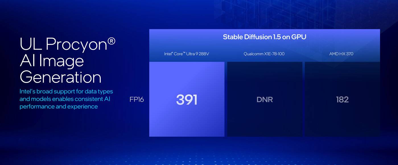 在 UL Procyon 的 AI Image Generation 测试中,Ultra 9 的 FP16 性能得分 391,AMD HX 370 为 182,高通 X1E-78-100 无法完成。