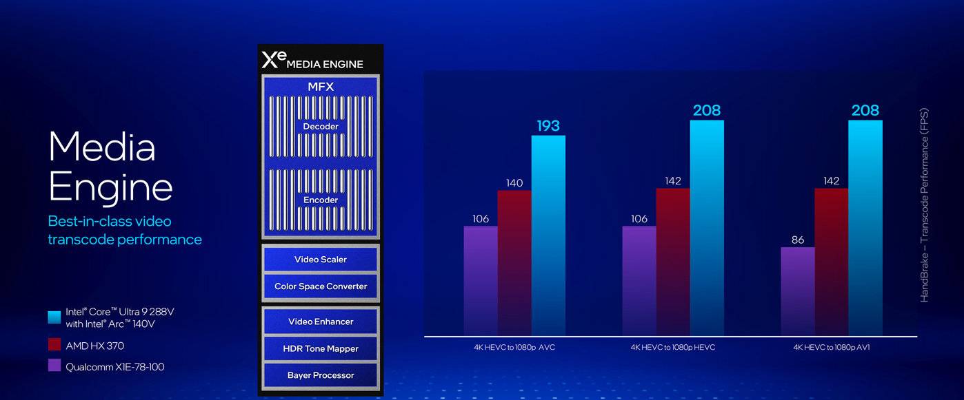 媒体引擎也依然是英特尔处理器中核显的强项,在编解码方面的支持更加全面,最高支持 8K 60 10bit HDR 的硬件编解码、AV1 格式硬件编解码、全新的 VVC(H266) 格式硬件解码,视频的转码速度上,竞品 AMD HX 370 以及高通 X1E-78-100 都远不及 Ultra 9 288V。