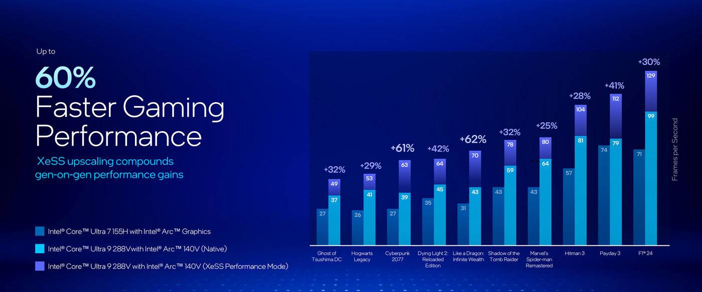 英特尔的 XeSS 技术会让游戏帧数再进一步,目前市面上已经有 120+款游戏支持 XeSS。Ultra 9 288V 相比于不开启 XeSS,在 XeSS 的 Performance 挡位后,10 款游戏中最高可以达成 60% 的帧数提升。