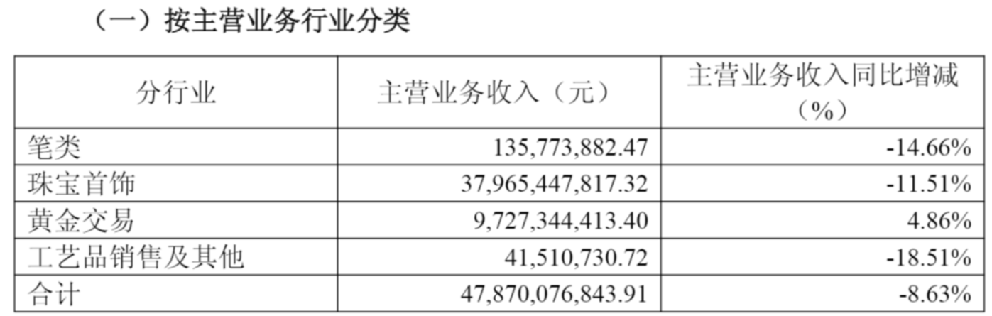 目前,公司业务包括以 「老凤祥」 为代表的黄金珠宝首饰,以 「工美」 为代表的工艺美术品,以 「中华」 为代表的笔类文教用品。其中,黄金珠宝首饰业务主要由老凤祥有限承担,今年上半年贡献了 99.79% 收入,是公司的核心板块。