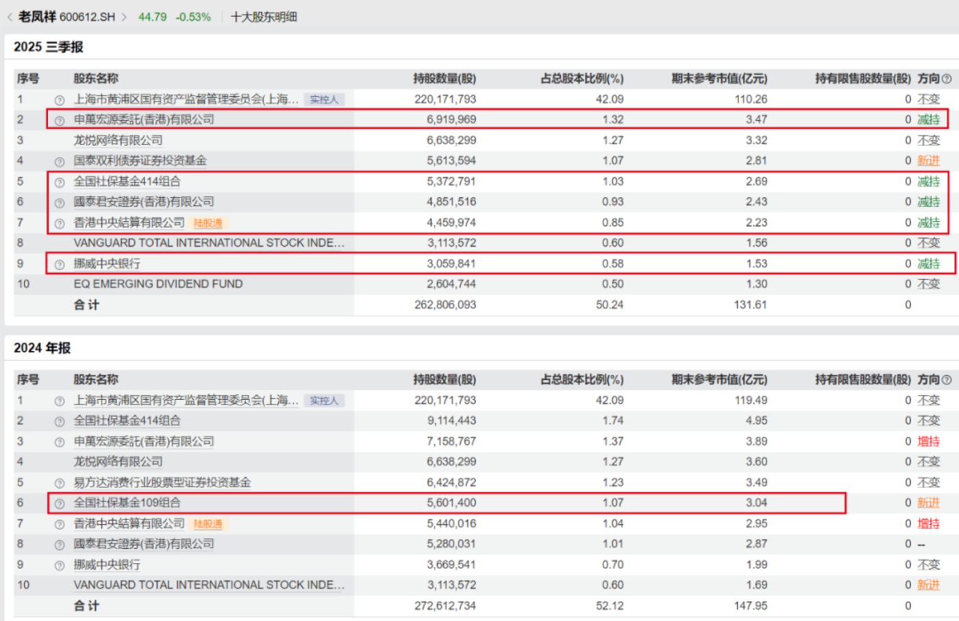 和 2024 年底的十大股东相比,今年前三季度,有 5 家股东在减持老凤祥,全国社保基金 109 组合则退出了前十大股东行列。