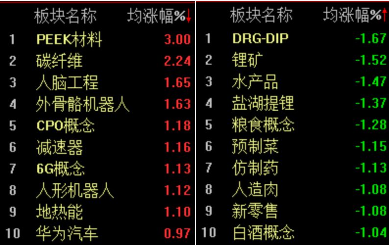 板块方面,碳纤维、PEEK 材料、化纤行业、机器人执行器、石油行业、贵金属等涨幅靠前,而医药商业、乳业、社区团购则表现不佳,跌幅靠前。