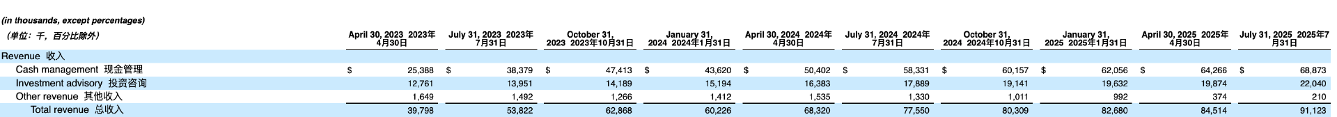 但现实是,近年来支撑 Wealthfront 估值与现金流的主力,早已从“ 顾问费” 悄然切换为“ 现金管理收入 (Cashmanagement)”。