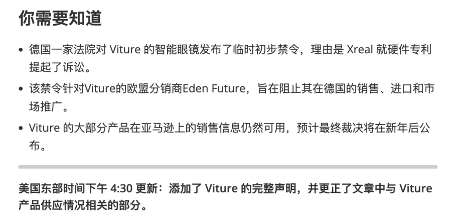 一个是在时间线上,德国慕尼黑第一地区法院在 11 月 13 日就当庭判决 XREAL 胜诉,临时禁令生效 (禁止相关产品在德国市场销售、投入或使用),而媒体却在 12 月 19 日开始集中报道 VITURE Pro 在欧洲下架一事。