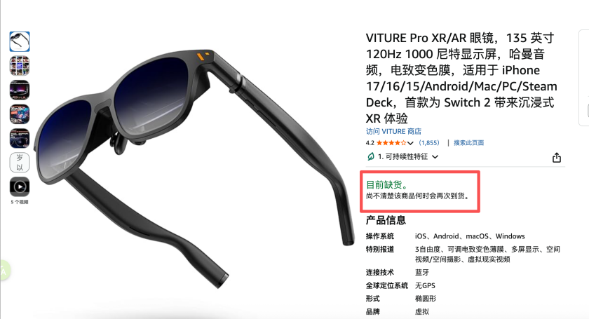 市象观察线上销售平台发现,截至 12 月 27 日,在亚马逊德国站点搜索“VITURE Pro” 显示“ 目前缺货,尚不清楚何时会再次到货”,但 Luma 系列产品仍在售。同时 VITURE Pro、Luma 系列在亚马逊欧洲其他地区均处于在售状态。