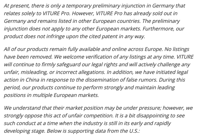 起初,12 月 19 号钛媒体独家报道称,“ 德国慕尼黑第一地区法院已作出一审裁决,当庭批准了一项临时禁令,要求 VITURE 的香港经销商 Eden Future HK Limited 立即停止在德国境内提供、投放市场、使用或进口相关侵权产品。目前,VITURE Pro 已在亚马逊德国、法国、意大利、西班牙等 9 个欧盟站点下架。”