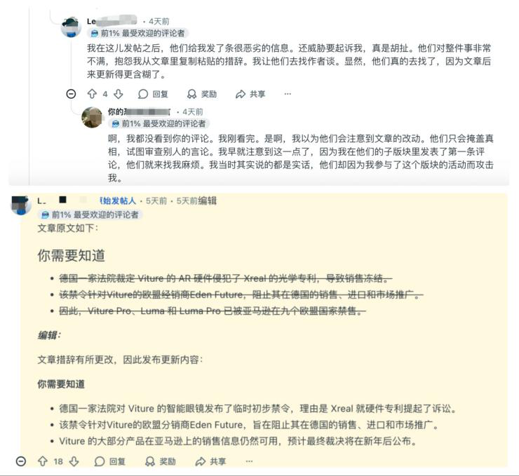同时,在相关讨论区也有人表示自己在 VITURE 官方频道讨论该事件后被删帖,并且,该贴下面的网友回复耐人寻味。而该网友讨论的对象正是 XREAL 最新回应中,可能涉及禁售范围的 VITURE Luma 系列,该系列是目前 VITURE 的重点在售项目。
