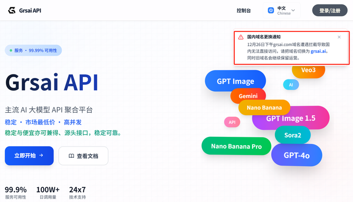 我知道你急,但你先别急。没跑路,因为不可抗力因素 (被墙了) 导致国内无法访问,如果你会科学上网有魔法还是可以正常用 Grsai.com,但如果你不知道啥叫科学上网啥是魔法,那你就无法正常使用!本篇文章会提供国内用户访问方法、以及 Grsai API 接入实战指南,帮助大家快速上手并稳定使用 API 接口服务。