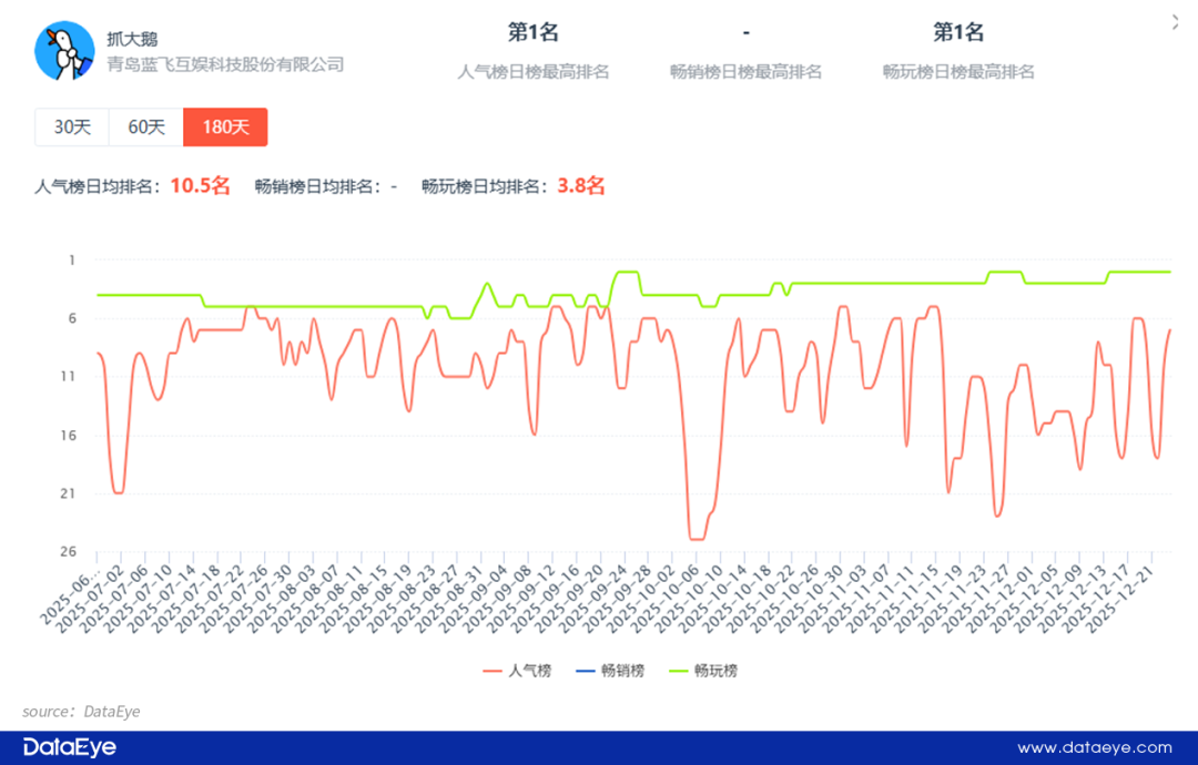 以 《抓大鹅》 为例,DataEye-ADX 数据显示,该游戏在近 180 天,畅销榜排名稳定在 TOP5。而该产品的火爆离不开可爱的角色形象与魔性的玩法设计,相关内容自带话题性且易传播。巨量引擎数据显示,《抓大鹅》 通过角色 IP 化的运营,带动产品 DAU 增长 8%,而日均流水也提升超过 19%。