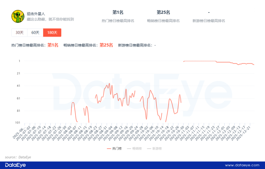 以 《狙击外星人》 为例,该游戏在 8 月底将原来是单机玩法的” 你狙我躲“,升级为社交模式,支持真人 PK 的好友房玩法。只是新玩法上线初期表现平平,但经过一段时间的发酵之后,10 月底突然爆发。DataEye-ADX 数据显示,《狙击外星人》 进入 11 月之后基本稳定在抖音人气榜 TOP5。
