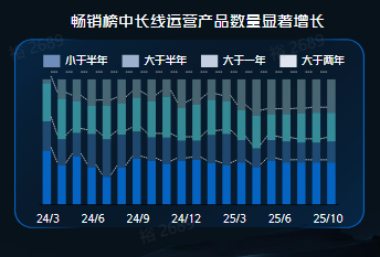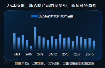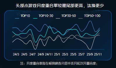 数据显示,最近一年头部小游戏月度重合率较腰尾部高,淘汰和更新较少。同时在 2025 年内,新入榜的小游戏产品变少,新游整体突围难度变高。更重要的是,当下小游戏畅销榜中,长线运营产品呈现明显增长。
