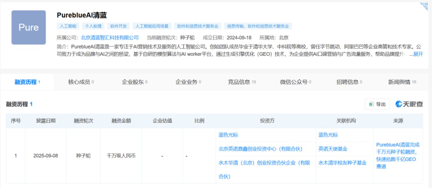 国内的工具型 GEO 服务商里,PureblueAI(清蓝智能) 备受关注,这家公司由前豆包大模型市场负责人鲁扬创立,今年 9 月刚获得了蓝色光标与英诺天使基金联合领投的千万元种子轮融资。