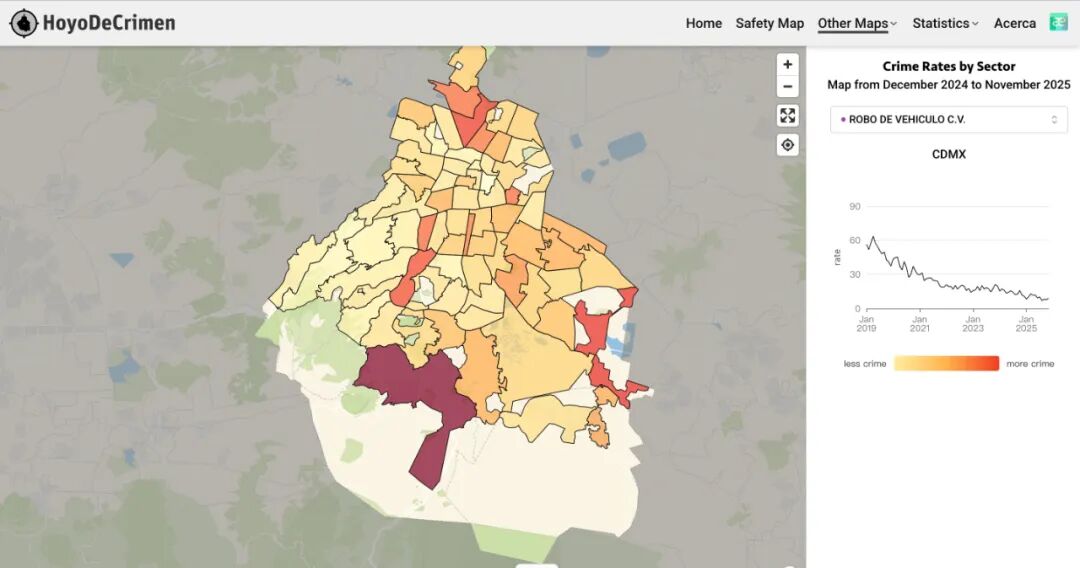 用 HoyoDeCrimen(Crime Map) 还有 ChatGPT,来整体查看墨城的治安情况,在网上把自己要去的地址输入进去,可以通过地图看到各个区真实的报警和治安情况,红色和深色区域不要去,夜晚尽量避免出行。