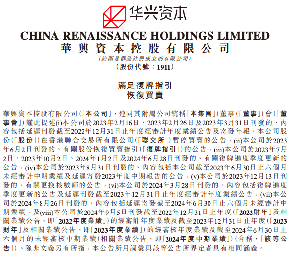 同日,华兴资本也发布公告宣布已满足港交所复牌指引的所有要求,并已经向港交所申请集团股份于 2024 年 9 月 9 日起恢复买卖。