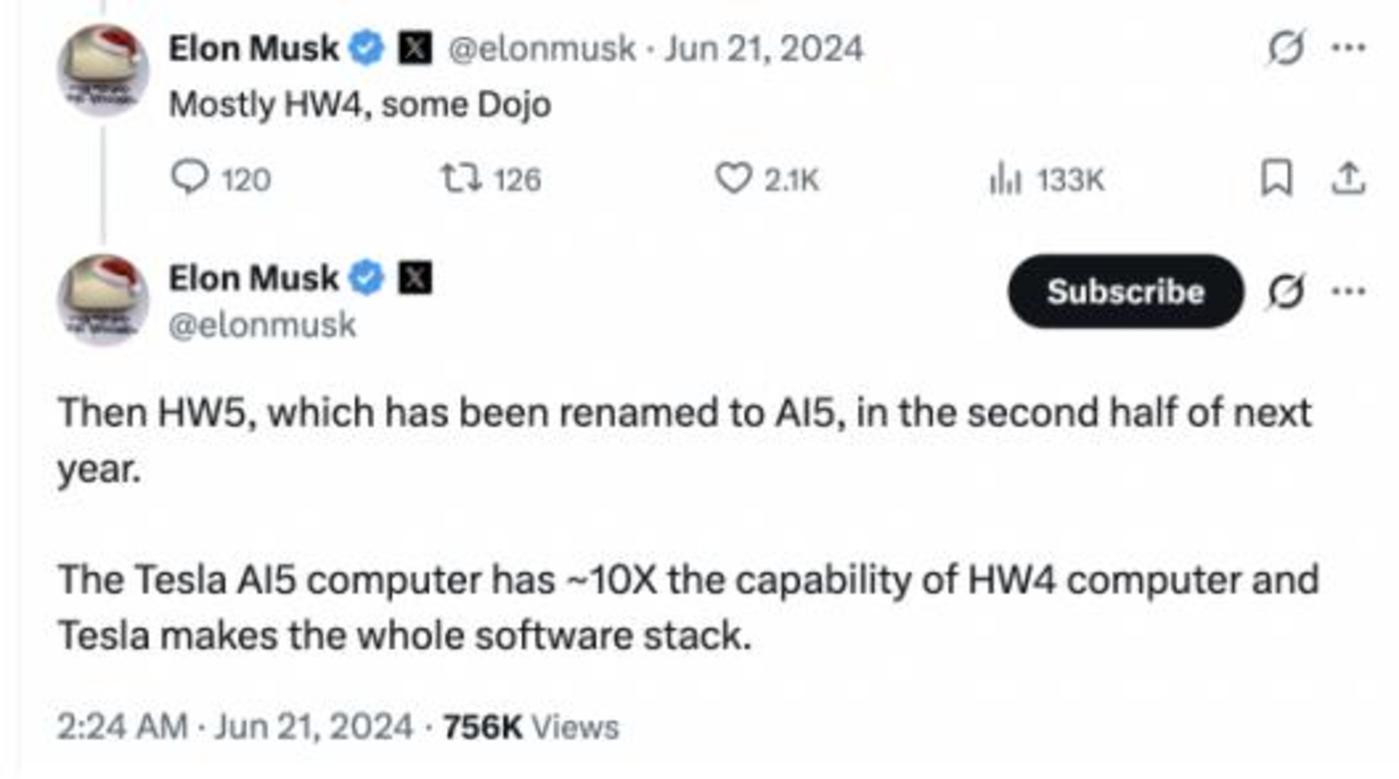 不仅如此,到 2025 年,特斯拉在 FSD V13 的基础上,又推出了参数量高达 10 倍的 FSD V14,模型参数量的倍数级放大,意味着车辆能够理解更复杂的环境信息。而同时,马斯克还多次在社交媒体上透露,特斯拉自研的下一代 AI5 算力平台,算力将会是 HW4(后来被命名为 AI4) 的 10 倍。