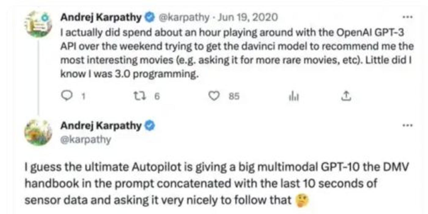 2020 年 6 月,硅谷知名 AI 大神、时任特斯拉 AI 负责人 Andrej Karpathy(业内简称为 AK) 在社交媒体上发表了自己对于自动驾驶未来发展的思考,他的原话是: