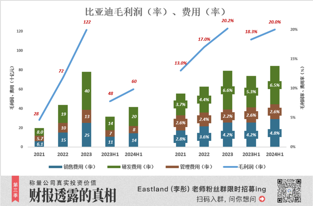 2023 年,比亚迪三项费用合计 782 亿、总费用率 13%,比毛利润率低 7.2 个百分点。