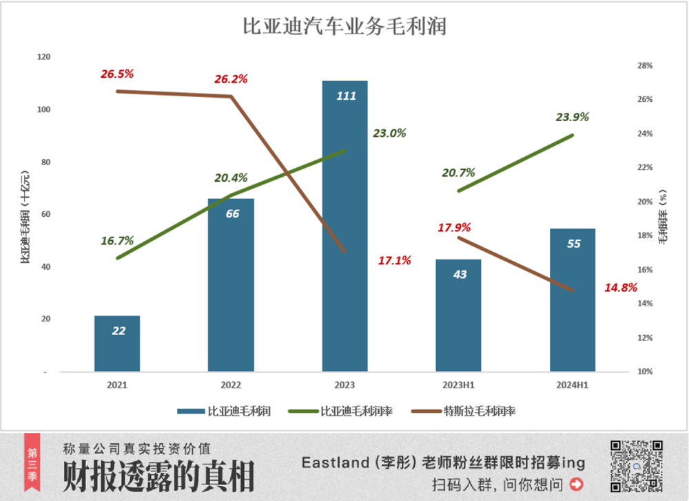 2024 年 H1,比亚迪汽车业务毛利润 547 亿,同比增长 26.6%;毛利润率 23.9%,较 2023 年 H1 提高 3.3 个百分点。