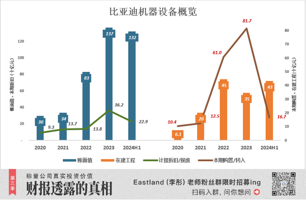 2024 年 H1,机器设备账面值增加项 (购置/转入) 为 167 亿,减少项 (折旧/报废) 为 229 亿。期末机器设备账面值回落至 1323 亿。