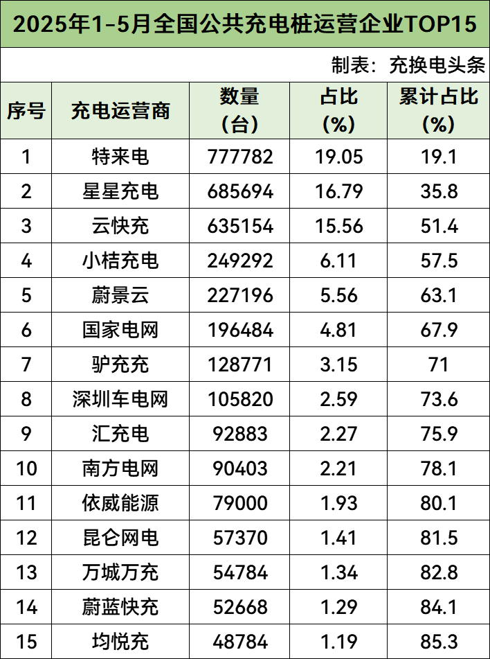 另一方面,充电桩行业的集中度正在快速提升,市场格局正在发生深刻变化。2025 年上半年数据显示,特来电、星星充电、云快充等行业前 15 家运营商已经占据全国超 80% 的公共充电桩市场份额,马太效应显著。