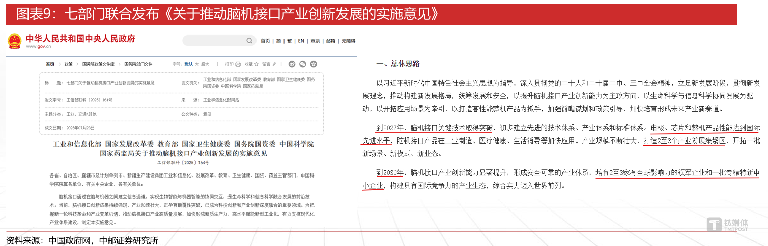 回顾 2025 年的中国脑机接口政策图谱,其力度、密度与高度均属空前。这场政策东风始于今年 7 月,工业和信息化部等七部门联合发布的 《关于推动脑机接口产业创新发展的实施意见》。这份文件的重要性在于,它首次从部委层面,系统性地为脑机接口产业规划了发展路径、重点任务和保障措施,标志着其管理主体从单一的科研或卫生部门,扩展至关乎产业生态的宏观管理部门,产业的“ 正规军” 地位得以确立。