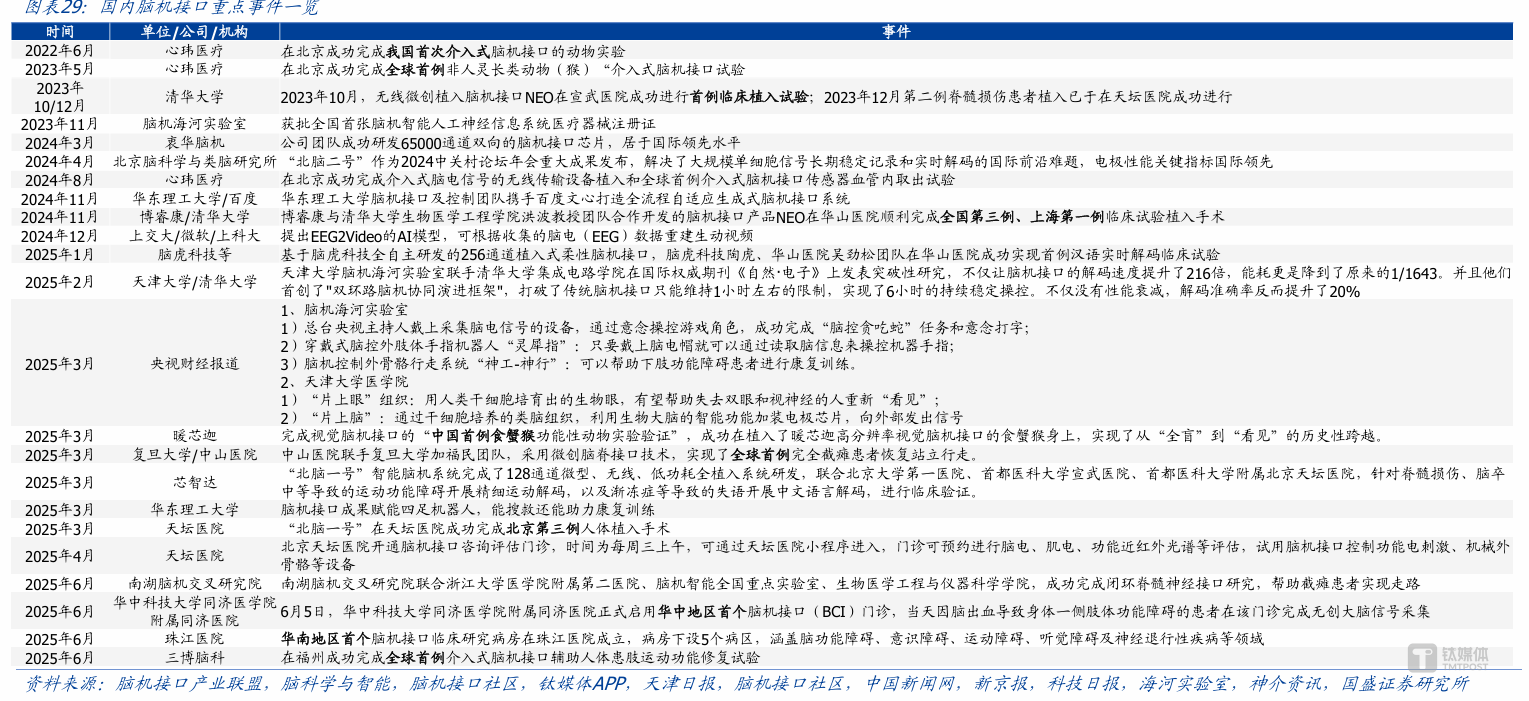 此外,诚益通、爱朋医疗、三博脑科、创新医疗等国内上市公司也纷纷加快在脑机接口相关业务的布局。例如,博睿康与清华大学洪波教授团队联合研发的 NEO 半侵入式系统已完成多例临床手术植入,正引领国内产业向更高性能迈进。这些上市公司的介入,为行业带来了更多的资金、市场渠道和临床资源。