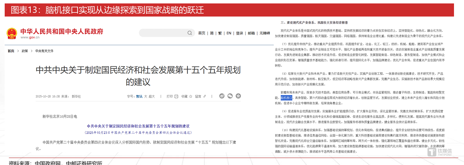 真正的战略级信号出现在三个月后。《中共中央关于制定国民经济和社会发展第十五个五年规划的建议》 正式发布,将“ 脑机接口” 明确列为未来产业六大方向之一。这意味着,脑机接口不再仅仅是科技界关注的“ 前沿技术”,而是与国家长期竞争力紧密绑定的“ 战略棋子”,其产业地位获得了最高层次的确认。