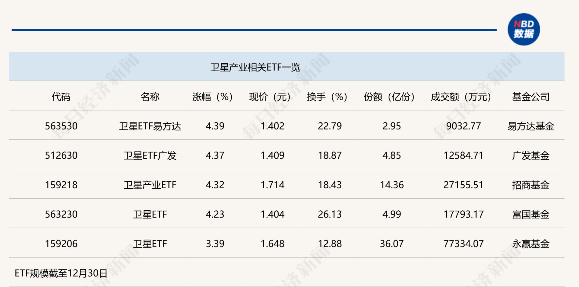 点评:卫星 ETF(563230) 今日上午涨幅达到 4.39%,其份额为 2.95 亿份,半日成交金额为 9032.77 万元,该 ETF 追踪的是中证卫星产业指数。追踪该指数的 ETF 还包括卫星 ETF 广发 (512630)、卫星产业 ETF(159218)、卫星 ETF(159206) 等。其中,卫星 ETF(159206) 规模较大,其份额达到 36.07 亿份,半日成交金额为 7.73 亿元。