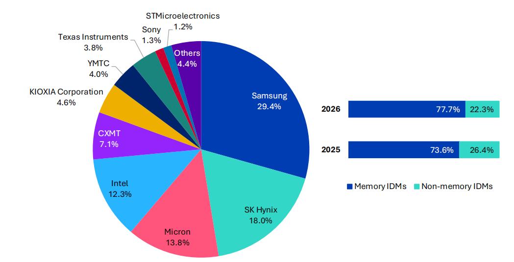 Omdia 认为,内存芯片投资将于 2026 年加速。2026 年内存芯片支出将再度飙升,使内存芯片代工厂的资本支出占比达到 77.7%。2025 年将成为 DRAM 收入连续第二年实现增长,且预计增长势头将持续至 2029 年,这一增长幅度前所未有;AI 需求驱动 NAND 到 2026 年价格将上涨 40%。