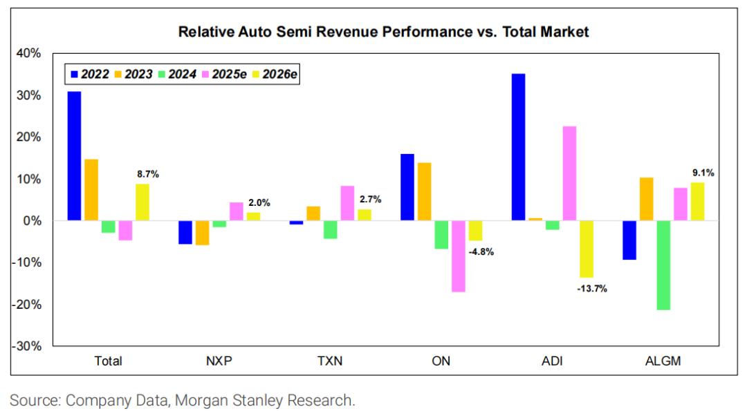 2025 年汽车市场复苏滞后于其他终端市场,但大摩预计 2026 年将出现增长势头的转折。大摩认为,补货周期可能会在 2026 年上半年左右形成,即使终端需求没有同步回升,也会带来上行动力。其中,大摩点名恩智浦,评价其是预计明年营收将超越历史峰值的仅有的两家公司之一。原因是,恩智浦汽车业务占比平均保持在 50% 以上高位。