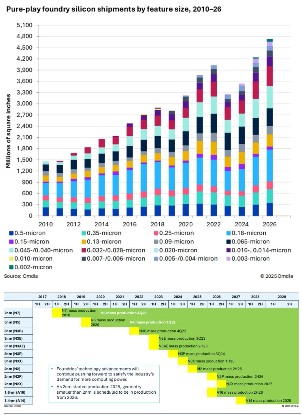 从代工来看,高性能计算 (HPC) 将在 2026 年主导芯片代工、技术进步及营收增长。Omdia 数据,2026 年,7nm 到 2nm 硅预计将占总收入的 59%,但只占纯代工厂行业硅总出货量的 10%